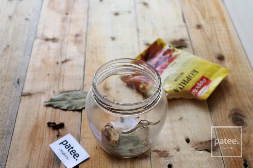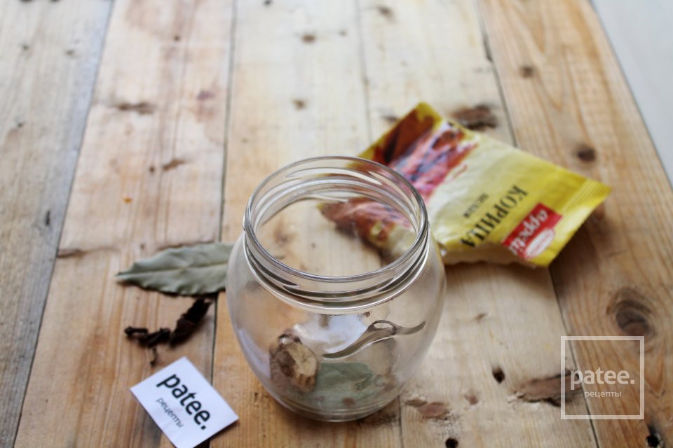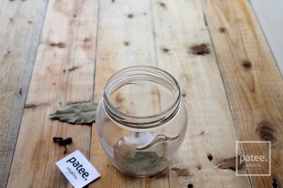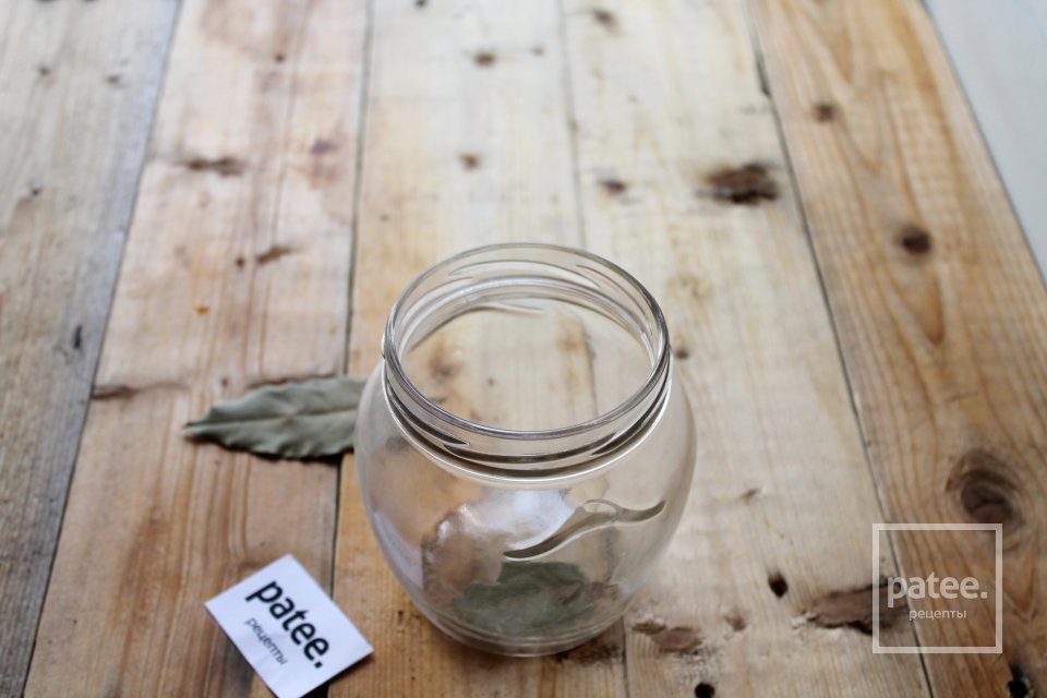 4. На дно предварительно простерилизованных банок кладем по 3 веточки вымытой петрушки, 3 штучки перца черного, 3 штучки перца душистого горошком и по одному лавровому листику.