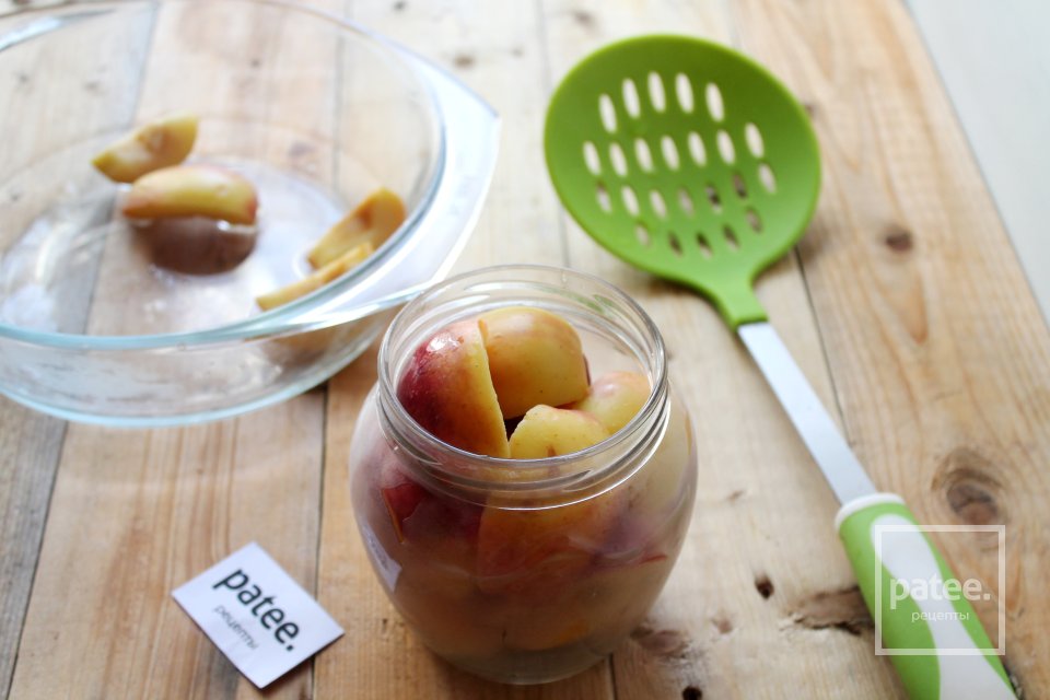 5. Затем в банки складываем нарезанные кусочками яблоки.