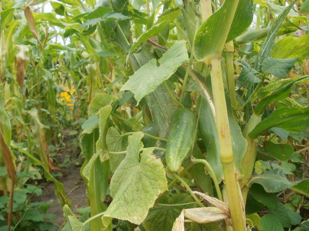 На открытых пространствах, как считают американские кукурузоводы, кукурузу нужно выращивать хотя бы в 4-ре ряда. Это снижает ветровую нагрузку на каждое растение и предохраняет их от ломки ветром. При этом можно как сочетать одно растение огурца с одним растением кукурузы, так и попробовать подсадить три растения огурца к одному растению кукурузы, выделяя этому квартету один квадратный метр площади почвы. Тогда можно надеяться получить с этой площади до 30-ти кг. зеленцов огурцов и пару початков кукурузы.