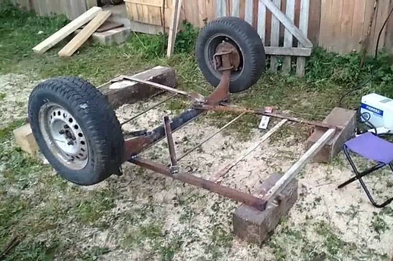 Теоретически, можно использовать заднюю балку от любого легкового автомобиля. При этом удобнее воспользоваться задней подвеской переднеприводного авто возможно меньшей массы и размеров. Хорошо подойдет по нагрузочной способности подвеска автомобиля «Ока».