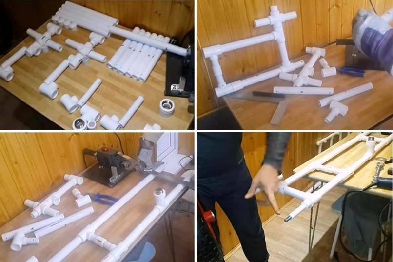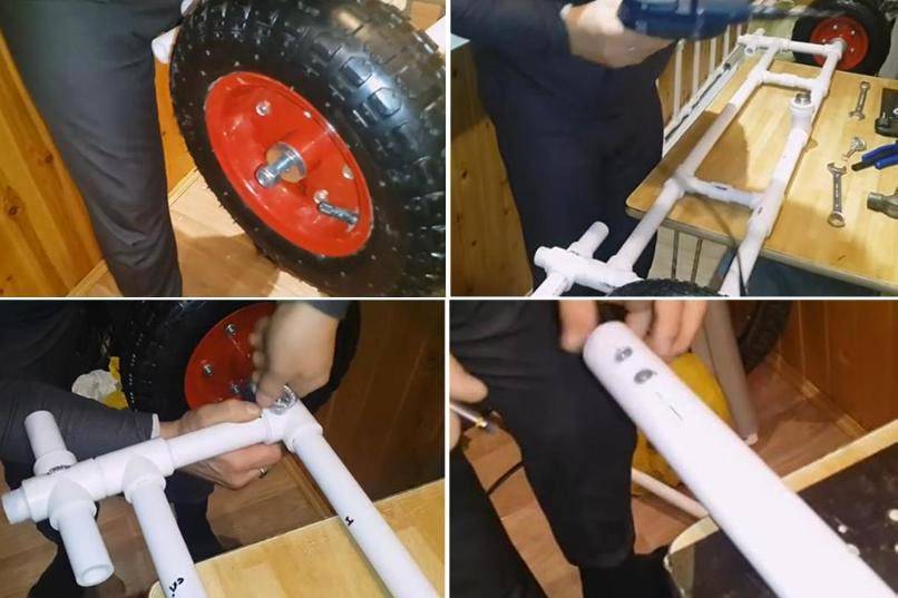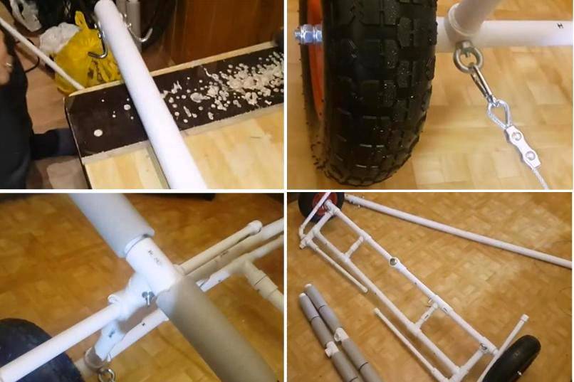 Из пластиковых труб можно сделать более функциональную тележку для перемещения надувной лодки. У данной конструкции имеются продольные ложементы, на которые опирается корпус плавсредства, маячки для ориентации при погрузке в воде, ручка для перемещения. Также предусмотрена регулировка длины ручки и ширины установки маячков, что обеспечивает возможность перемещения лодок разных размеров.