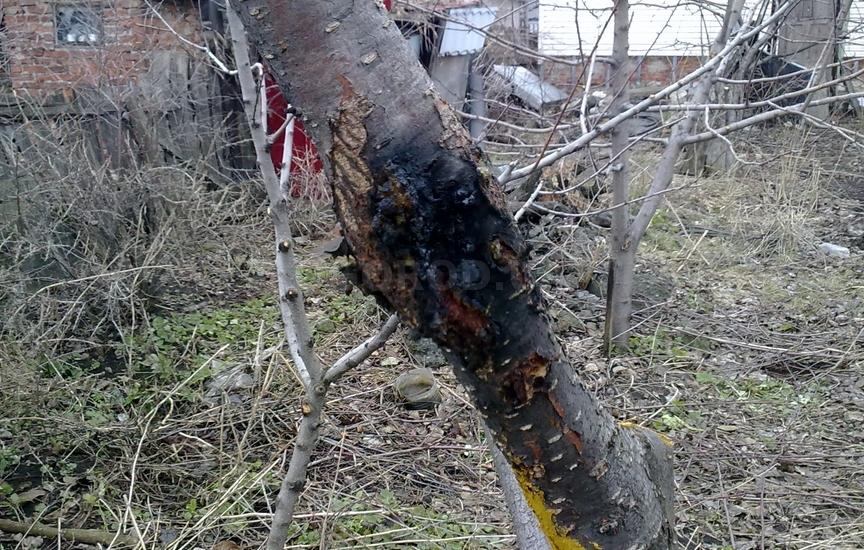 Возбудитель болезни захватывает новые участки, проникает в древесину ствола, в старые ветви. Кора на них трескается, образуются наросты и глубокие камедные раны.