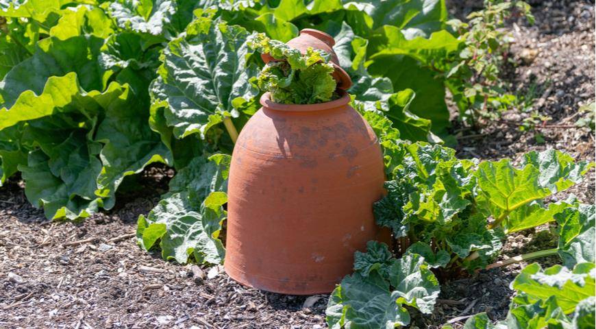 Выращивание ревеня в темноте делает стебли менее кислыми и более нежными. С этой целью фермеры в начале весны накрывают кусты ревеня специальными высокими колпаками или горшками, не пропускающими свет.