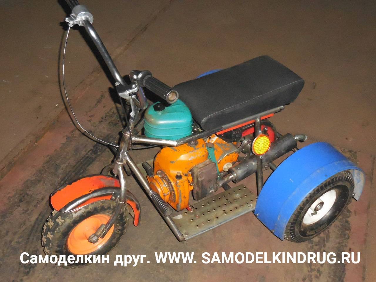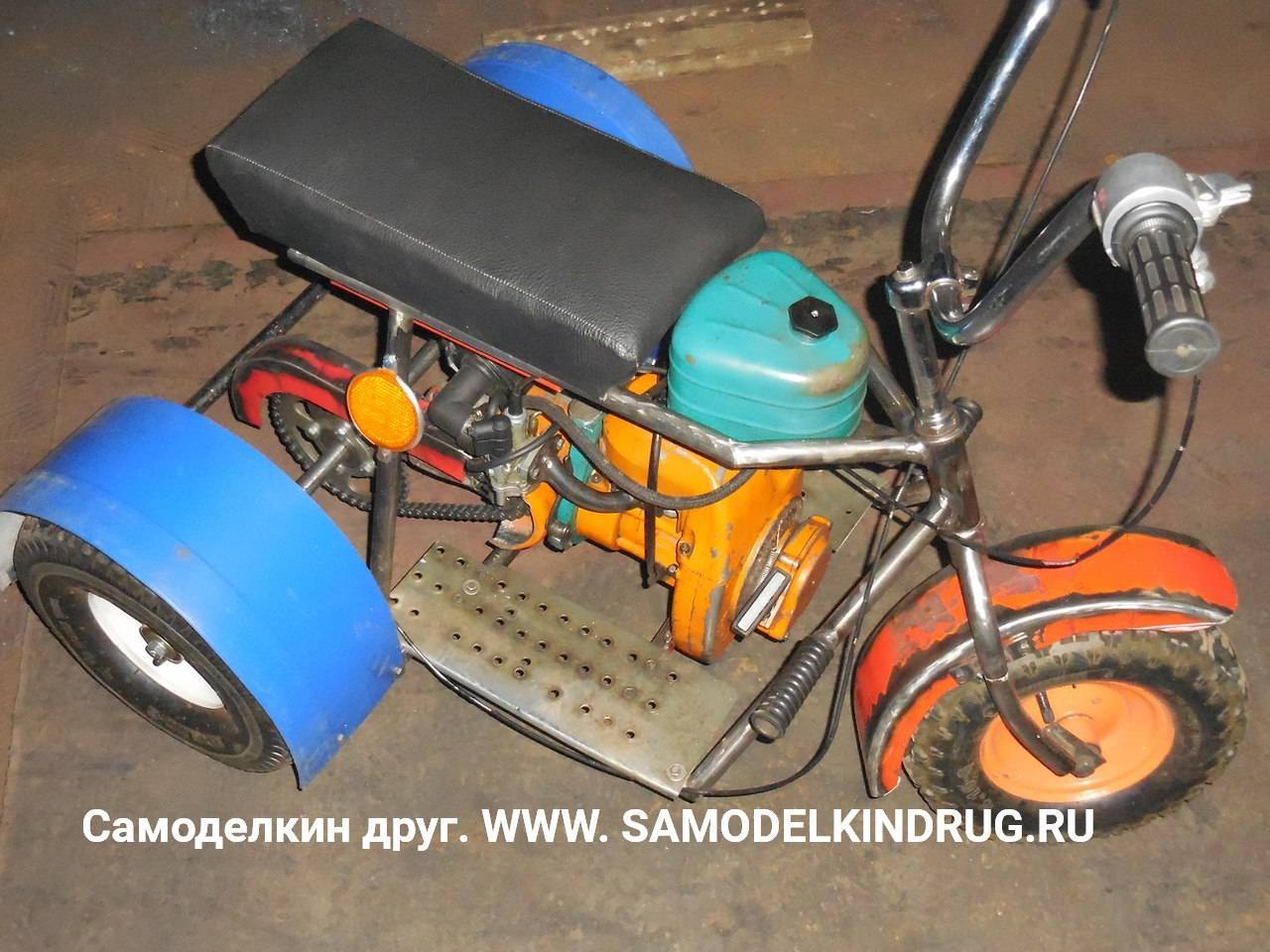 Дорогие друзья и гости сайта «Самоделкин друг» разрешите представить вашему вниманию байк мопед трехколесник с двигателем от бензопилы «Урал» сделанный мной для внуков. Меня зовут Гайнетдин Булатов. С 5 лет меня зовут Гена мне 49лет мини технику я делаю для внуков. У меня их трое. Технику из советских Бензопил делаю потому что они сейчас валяются без дела в гаражах и сараях. У них принудительное охлаждение и они достаточно мощные для самоделок.