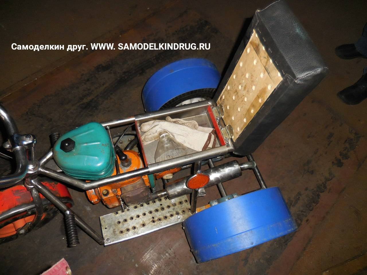 Имея чертежи самодельной рамы, можно собрать очень мощную технику. При сборке агрегата используются запчасти от скутера, автомобилей, бензопилы Дружба, мотоцикла Урал и пр.