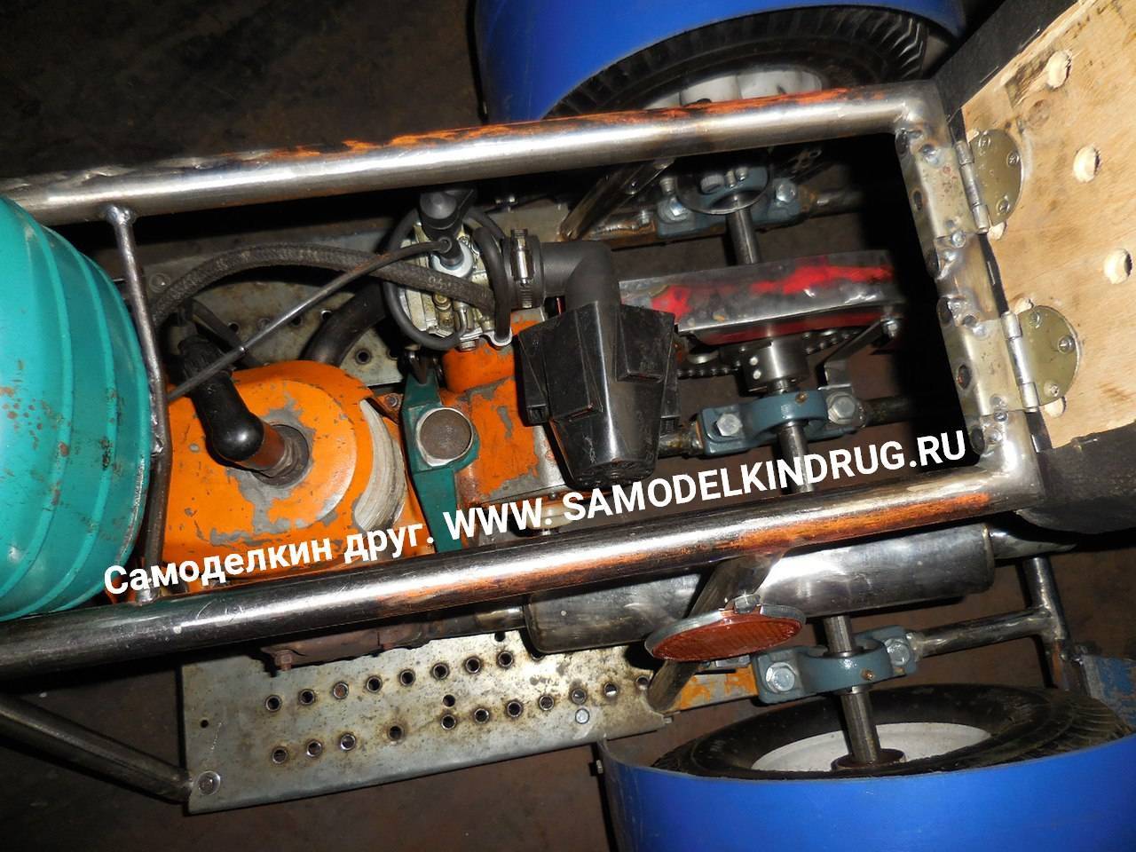 Вместо редуктора можно установить две цепные звездочки, которые соединяют двигатель с редуктором, а редуктор с мостом. Вариатор от скутера можно установить на двигатель. Аккумулятор устанавливается над редуктором.