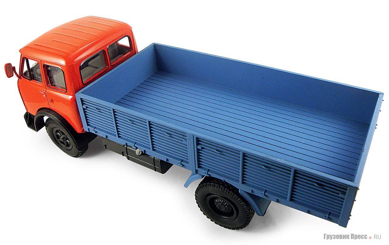 Ещё один сюрприз нас поджидает при разглядывании грузовой платформы – она только на первый взгляд соответствует металлической платформе МАЗ-500А. В действительности она несколько иная – производитель не поленился сделать отдельную пресс-форму, которая учитывает вырезы под запасное и задние колёса. А вот задние фонари откровенно не удались – на этой модели мы получили какие-то раскрашенные палки вместо стандартных фонарей типа ФП-130. Зато передние фары вполне похожи на прототип – в отличие от несколько переразмеренных на модели МАЗ-500А.