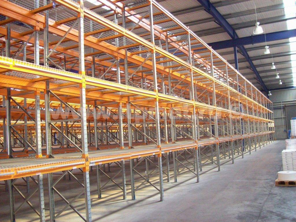 Конструкция позволяет размещать паллеты и поддоны вглубь стеллажей, поэтому, эта модель используется для размещения продукции с длительным сроком хранения и ограниченной товарной номенклатурой.