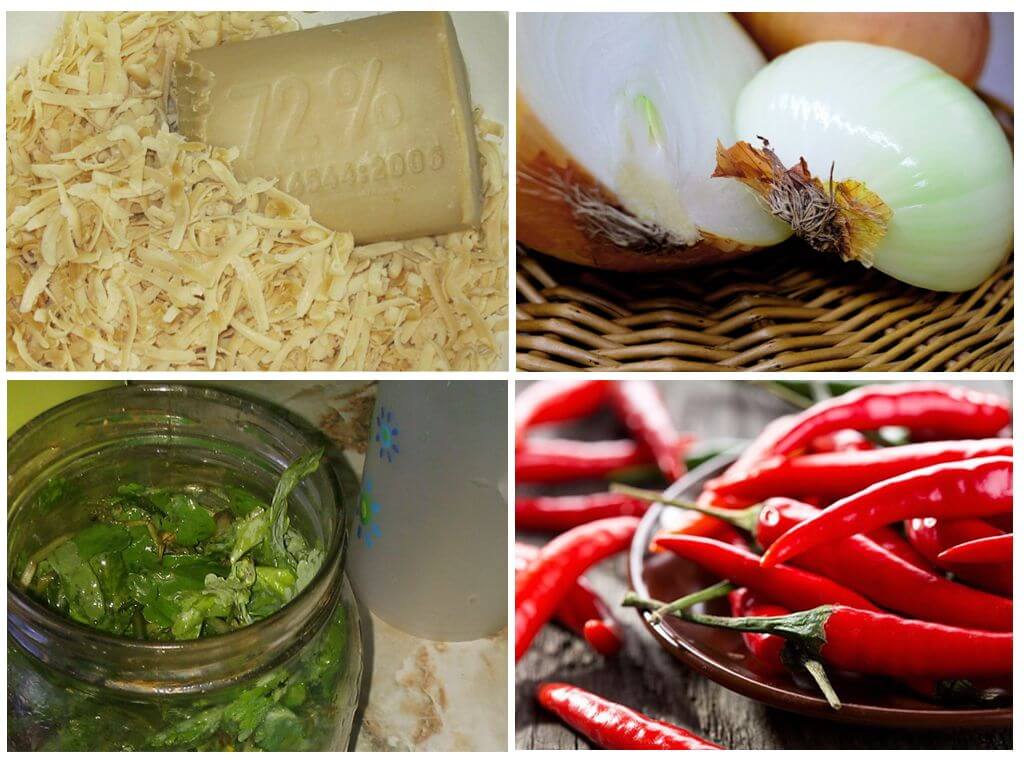- Свежий измельченный горький перец 100 г залить литром воды и варить 10-15 мин, далее настоять сутки и профильтровать. При обработке добавляется зеленое мыло из расчета: на 1 л воды 10 г перечной настойки и 5 г мыла;