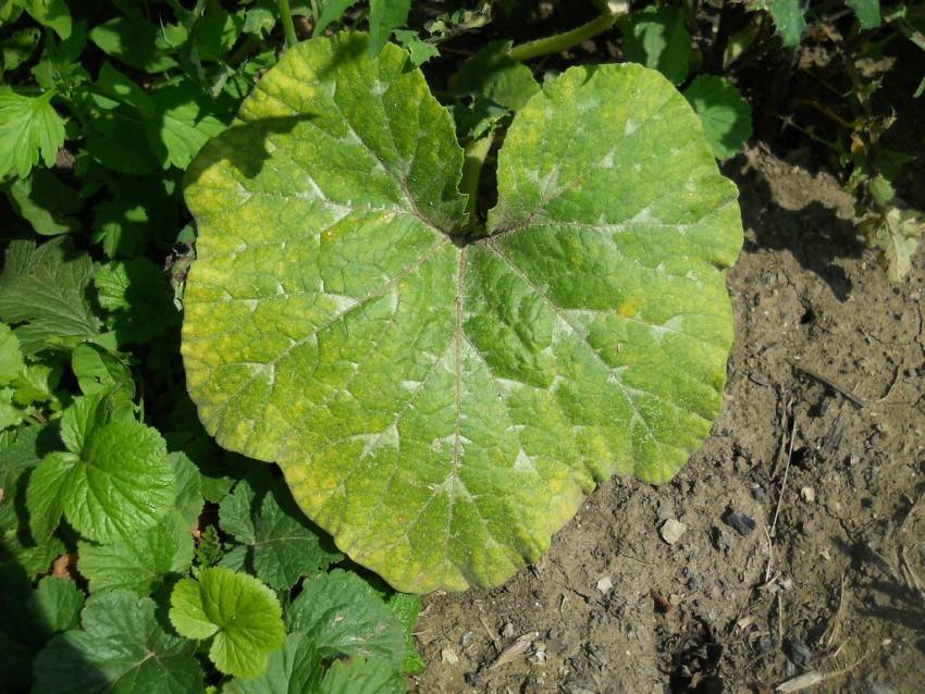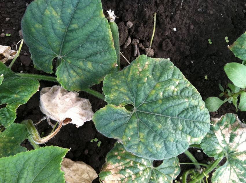 Признаки: при этой болезни листья огурцов покрываются желтыми пятнами, похожими на ожог от солнца, а снизу приобретают фиолетовый цвет.