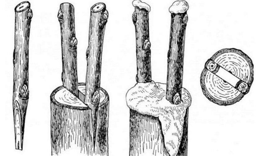 Если диаметр подвоя больше, чем у привоя, то можно привить их в расщеп. Для этого нужно срезать верхнюю часть привоя наискосок, а у основания подрезать в виде клина. Затем расщепить подвой в верхней части посередине и вставить привои в трещину. Такой способ подходит, если привой по размеру равен подвою. Если разница в размере значительная, трещина создаётся с края верхней части подвоя. У привоя в таком случае с крайней стороны должна сохраниться кора. Это позволит частям срастись равномерно.