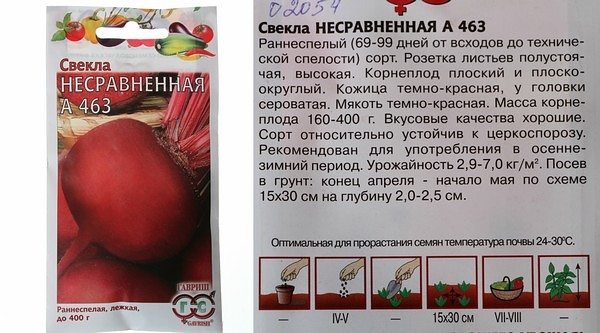 - Несравненная А 463 – созревание до 100 дней, масса 400 г, урожайность 7 кг/м2, кожица и мякоть темно-красного цвета, наличие черных колец. Высокий показатель выхода товарной продукции и лежкости, несклонность к цветушности, холодостойкость. Рекомендуется для использования в кулинарии и для зимнего хранения.