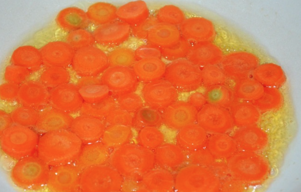 - Пока основные ингредиенты будут запекаться в духовке, морковь и лук нужно обжарить на оливковом масле, пока они не приобретут золотистый цвет.