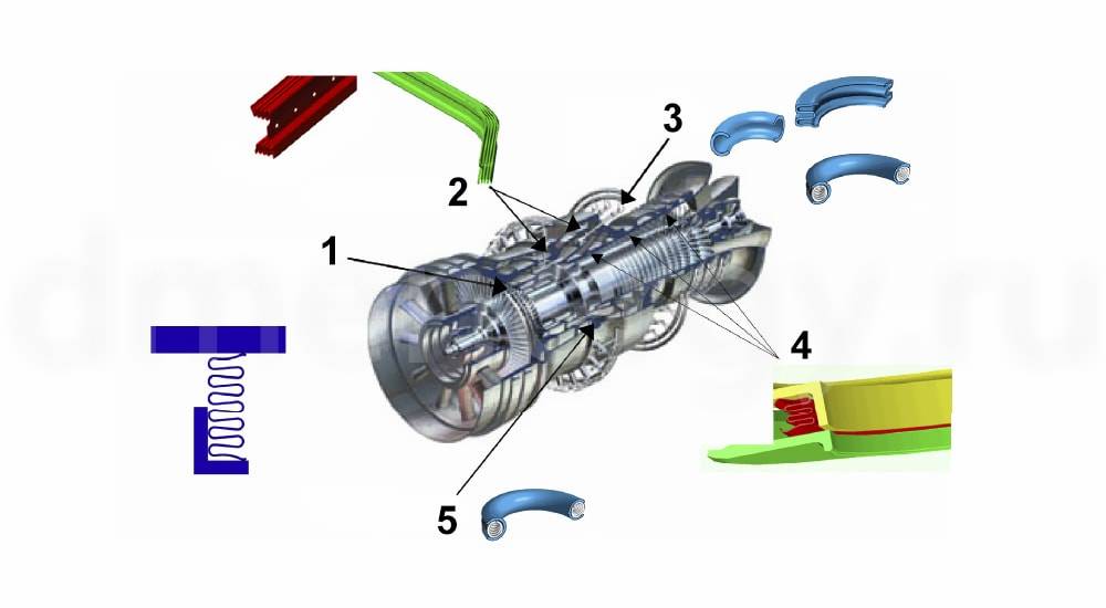 Плетенные и канатные уплотнители могут использоваться в различных местах в турбомашинах. Активно исследуются передовые материалы, в том числе цельная/композитная керамика, интерметаллические сплавы (например, алюминид никеля) и углерод-углеродные композиционные материалы для удовлетворения требований по температуре, долговечности и весу.