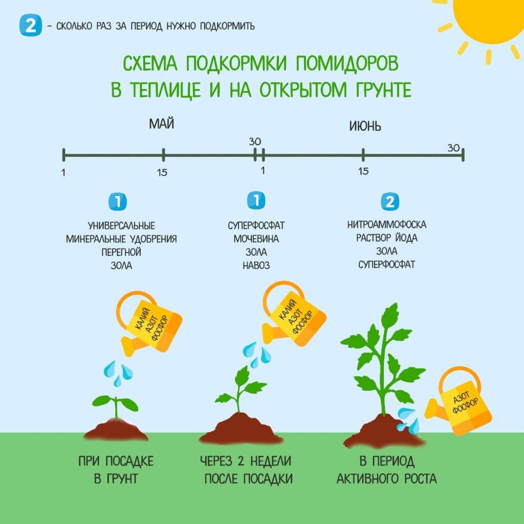 За сезон помидоры можно подкормить трижды. Первый раз — через 15 дней после посадки. Для этого нужно в 10 л воды добавить 0,5 л коровяка и 20 г суперфосфата. Расход на одно растение — 0,5 л. Подкормку вносят под корень сразу после полива.
