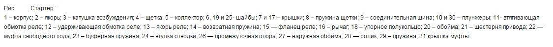 | 1. корпус; 2. стальной якорь круглого сечения; 3. соленоид возбуждения; 4. щетка; 5. шпилька; 6. шайба; 7. жесткий кожух; 8. крышка; 9. соединительная шина; 10. цилиндрический поршень; 11. сервисная обмотка; 12. шунтовая обмотка; 13. якорь; 14. возвратная пружина; 15. фланец; 16. рычаг; | 17. крышка; 18. стопорное полукольцо; 19. шайба; 20. обойма; 21. шестеренка привода; 22. муфта свободного хода; 23. буферная пружина; 24. втулка отводки; 25. шайба; 26. промежуточная опора; 27. наружная обойма; 28. роликовый механизм; 29. пружина; 30. плунжер; 31. крышка муфты. |