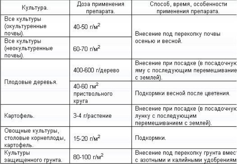 | Культуры открытого грунта | 15-30 г/м2 | Внесение весной или осенью под перекопку |