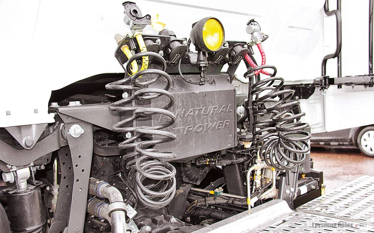 Предложенный мне автомобиль оказался укомплектован 13-литровым «Курсором», мощностью 460 л.с., выполняющим требования пятого экологического класса. Точное название силового агрегата – Cursor 13 CNG. Двигатель работает по циклу Отто, степень сжатия у него снижена до 12:1 (у дизельного Cursor 13 – 17:1). Ему не нужна система рециркуляции EGR и сажевый фильтр. Нейтрализацию выхлопа обеспечивает довольно простой трёхкомпонентный катализатор. Регулировка частоты вращения коленчатого вала при принудительном воспламенении осуществляется не подачей топлива, а при помощи электронной дроссельной заслонки с шаговым электродвигателем, получающей сигнал от электронной педали акселератора.