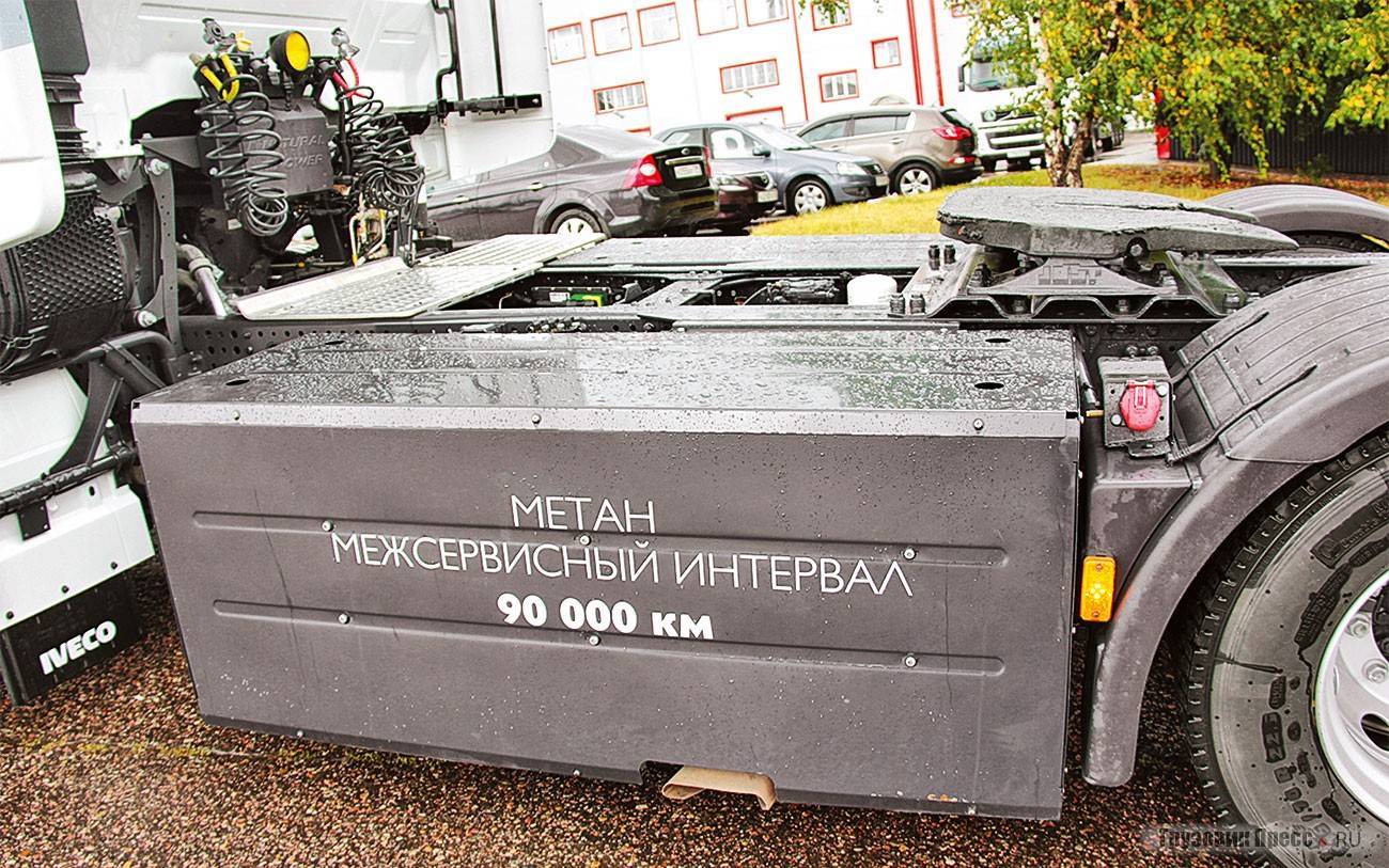 Две кассеты из восьми баллонов на борту тягача обеспечивают запас в 920 л сжатого метана. Его хватит примерно на 500 км – не густо для магистрального тягача, который имея на борту 1200 л дизтоплива способен преодолеть около 4000 км и более. Баллонное хозяйство тяжёлое и громоздкое, крадёт дорожный просвет, поэтому сопоставляю ему два дизельных бака слева и справа по 600 л.