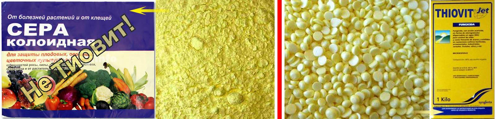 Коллоидная сера (слева на рис.) выпускается и успешно применяется до сиз пор: она вовсе не такой уж плохой пестицид — из-за того, что конечный продукт представляет собой в общем случайную смесь аллотропов, его эффективность несколько слабее, но спектр действия и область применения шире, чем у Тиовит Джета. Однако препаративная форма коллоидной серы смачивающийся порошок СП не весьма удобна в работе: порошок слеживается, слипается в комки. Рабочая суспензия коллоидной серы не настоящий коллоидный раствор, это довольно грубая взвесь, приготовить которую как следует трудновато, и нет гарантии, что опрыскиватель при работе не засорится.