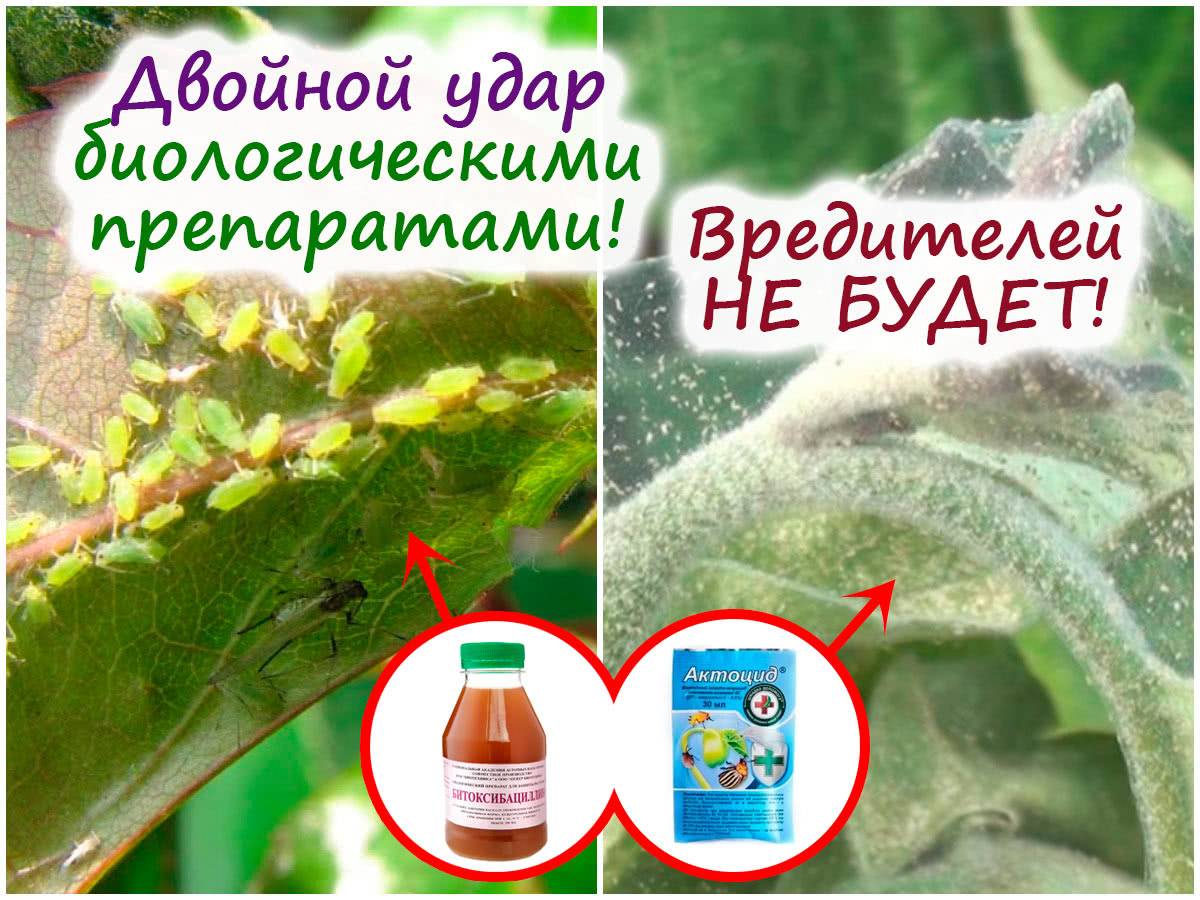 К биологическим — специальные средства, созданные на основе трав и растений, а не выведенных искусственно, как, например, химические. Поэтому они наносят минимальный вред самому растению, человеку и полезным насекомым, которые могут обитать рядом. К таким относятся «Акарин» и «Актофит».