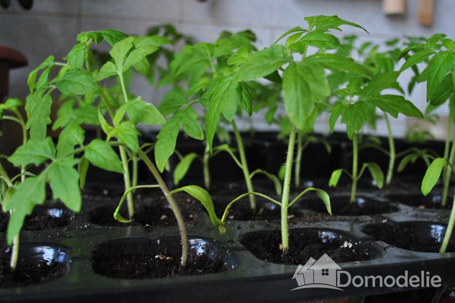 Посевы укрывают плёнкой или стеклом и убирают в теплое место. После проклевывания первых сеянцев укрытие снимают и выставляют рассадные емкости ближе к окнам. Если окна не выходят на солнечную сторону, томаты придется досвечивать.