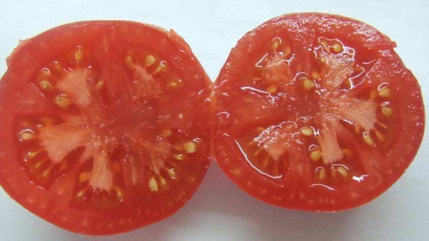 Спелые овощи округлые, ярко-красные, средней вес колеблется от 140 до 220 г. Семенных камер 3-4. Мякоть плотная, что усложняет приготовление свежевыжатых и консервированных соков.