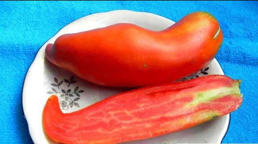 Описание плодов связано с характеристикой вкусовых качеств и внешнего вида. Помидоры вытянутой цилиндрической формы с носиком, чуть изогнуты и немного приплюснуты как бананы, длиной 20 см. При горизонтальном срезе наблюдается 3-5 камер с семенами.