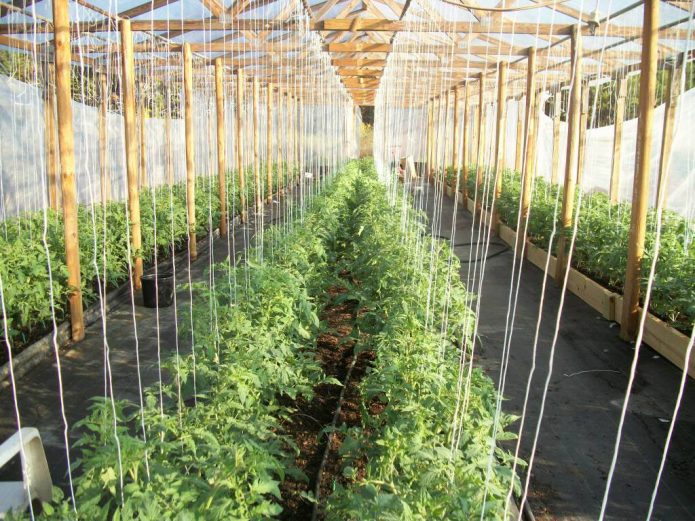 В теплице томаты подвязывают к шнурам, закреплённым к каркасу сооружения