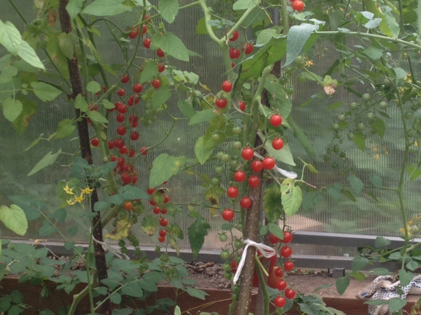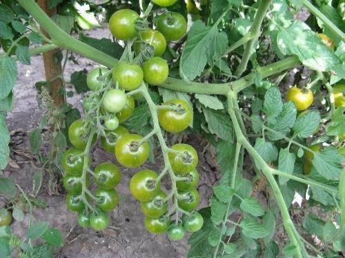 Наш климат востока Украины позволяет выращивать высокорослые томаты в открытом грунте. В 2017 году получилось так, что из ранних помидоров у нас были посажены только черри Дюймовочка. И мы их ели с конца июня вплоть до начала октября, а также закрыли около пятнадцати литровых банок на зиму. Было их 10 кустов, которые формировались в 2–3 стебля и подвязывались к свисающим с перекладины шнурам. Плодоносили регулярно, не болели, но высаживать мы их больше не стали, так как не понравилась довольно жёсткая и несъедобная кожица.