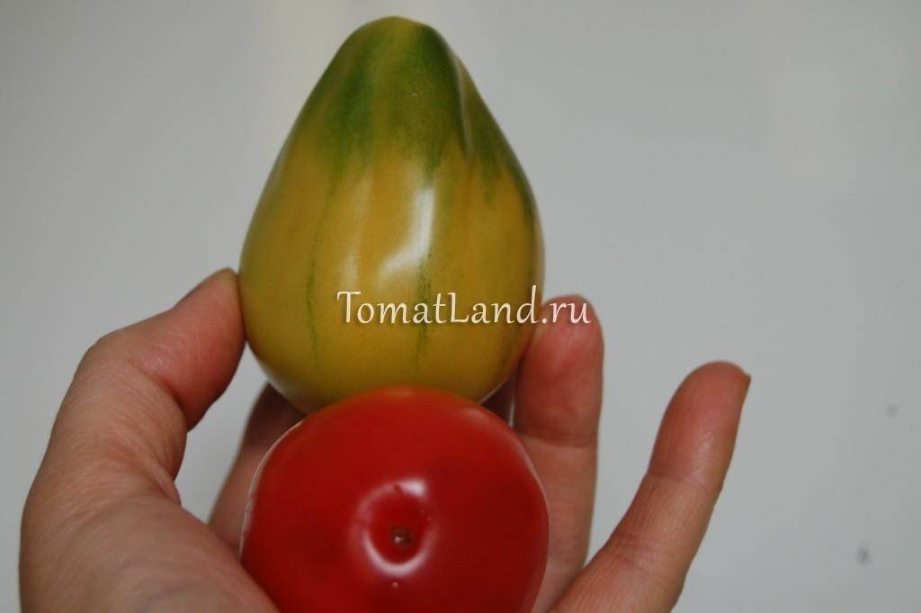 Плоды необычной грушевидной формы, их кожица плотная, гладкая, на некоторых экземплярах видна ребристость. В стадии полной спелости приобретают ярко-алый цвет. В каждой кисти вызревает до десяти плодов. Томаты небольшого размера, мясистые, вес каждого – 80-100 г. В плодах две камеры, семян в них очень мало. Содержание сухого вещества высокое. Вкус приятный, сладковатый, с легкой нотой кислинки.