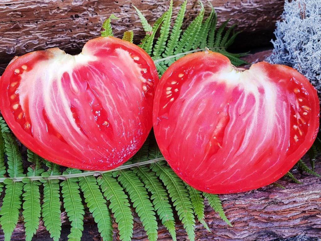Крупные, ярко-красные плоды могут достигать веса от 300 до 500 граммов. Они отличаются овально-сердцевидной формой, мясистой мякотью и приятным томатным сладким вкусом. У них практически нет камер и семян. При разрезании помидоры не распадаются, поэтому отлично подходят для консервирования дольками. Их можно использовать для приготовления соусов, соков, салатов.