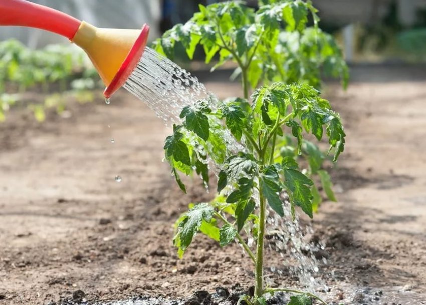 После высадки растения поливают, расходуя по 3-5 л воды на каждый куст. Пространство под томатами засыпают скошенной травой, соломенной резкой или опилками. Мульча, слоем 10 см, предохраняет корни от перегрева в жару, сохраняет влагу в почве, препятствует прорастанию сорняков.