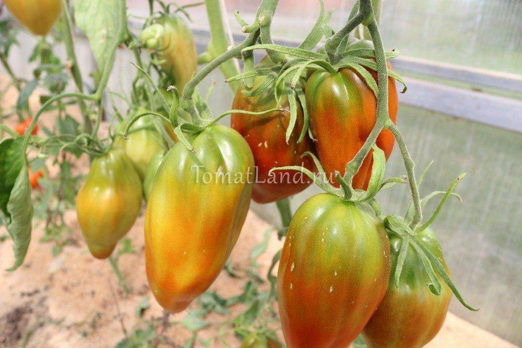 Обычно первая гроздь появляется над 3-4 постоянным листом, а каждая следующая – через пару листиков. Созревание плодов в гроздях бывает одновременным, однако сами грозди созревают не одновременно. Первыми темнеют плоды в нижних гроздях, но вот верхние грозди вызревать успевают не всегда. Поэтому их собирают недозрелыми – при этом их окраска бывает красной с черными боками – и оставляют дозаривать в помещении. Хотя все плоды доходят достаточно быстро, однако их вкус не бывает таким же приятным, как у собранных с кустов спелых плодов томата Черная гроздь.