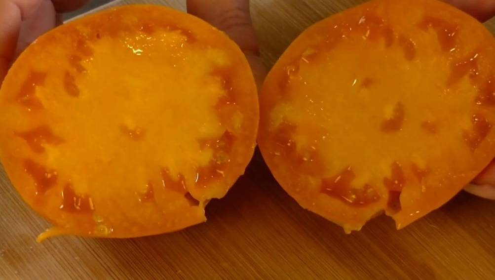 Форма сердцевидная, слегка округлая. Кожица гладкая и плотная, насыщенного ярко-оранжевого цвета. Семян в томатах мало. На вкус помидоры кисло-сладкие, сочные.