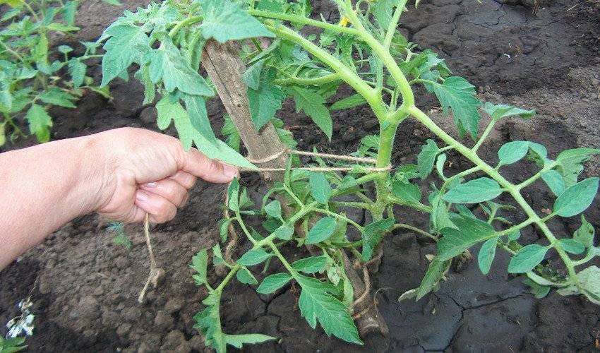 Когда растение достигнет 40 сантиметров, необходимо начинать подвязывание, чтобы закрепить куст и подготовить к началу плодоноса. В помидорном ряду натягивается проволока, закрепленная через каждый метр к колышкам или арматуре, такие кусты чувствуют себя достаточно свободно, и дают высокие урожаи. Альтернативой проволоке могут послужить колышки, вбитые рядом с кустом.