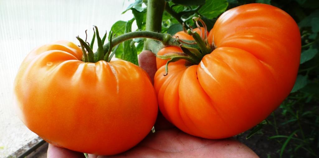 Для помидоров Оранжевый слон характерна ребристость ближе к плодоножке