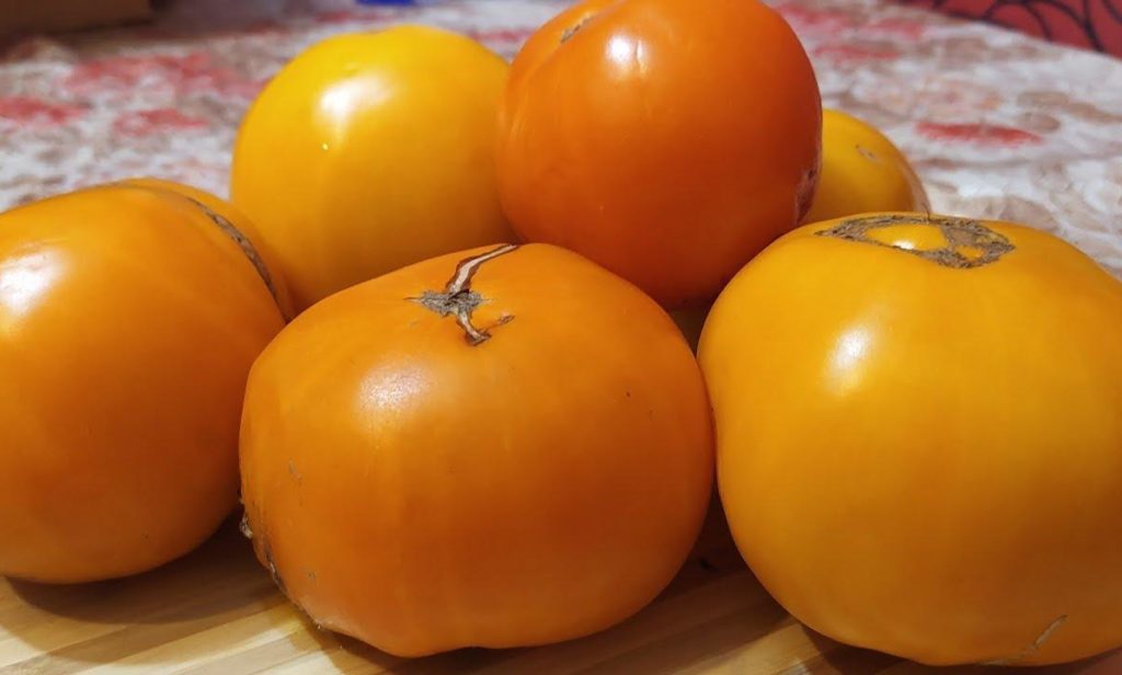Для помидоров Оранжевый слон характерна ребристость ближе к плодоножке