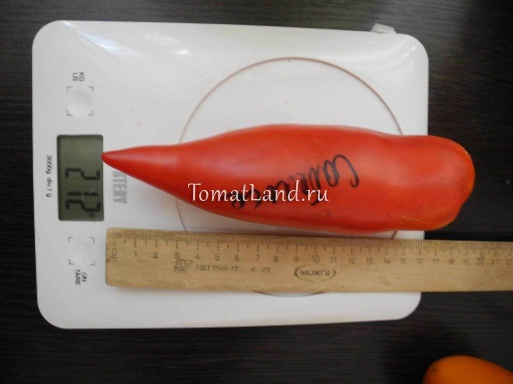 tomatland 20210916224012 922. jpg Растение индетерминантное, высокорослое, среднеоблиственное. Лист среднего размера до крупного, зеленый, гофрированный. Соцветие простое. Первое соцветие закладывается над 9 листом, последующие – через 3 листа. Плод цилиндрический, слаборебристый, окраска незрелого…