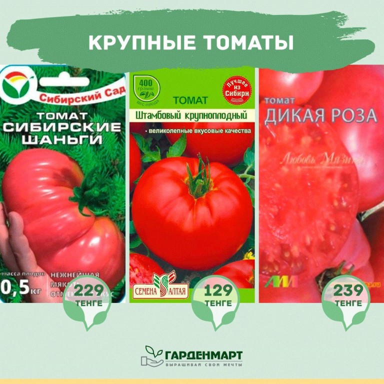 Крупноплодные томаты: Алсу, Бабушкин секрет, Батяня, Безразмерный, Бугай красный, Бугай розовый, Гусиное яйцо, Зимаревский великан, Кенегсберг, Маршал Победа, Орлиный клюв, Орлиное сердце, Сибирский килограмм, Малиновый тюлень, Малахитовая шкатулка.
