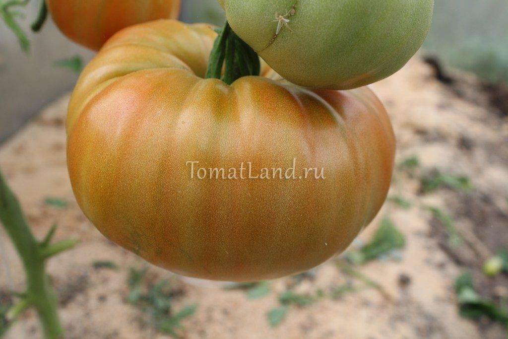 Техническая спелость характеризуется темным оранжевым цветом, иногда у плодоножки наблюдается более светлый оттенок, с вкраплениями зеленого цвета. Плод крупный, вес его может превышать 400 гр. Вкус помидоров сладкий, без кислинки. Урожайность может колебаться, но она в 2 раза больше в теплицах, чем в открытом грунте.