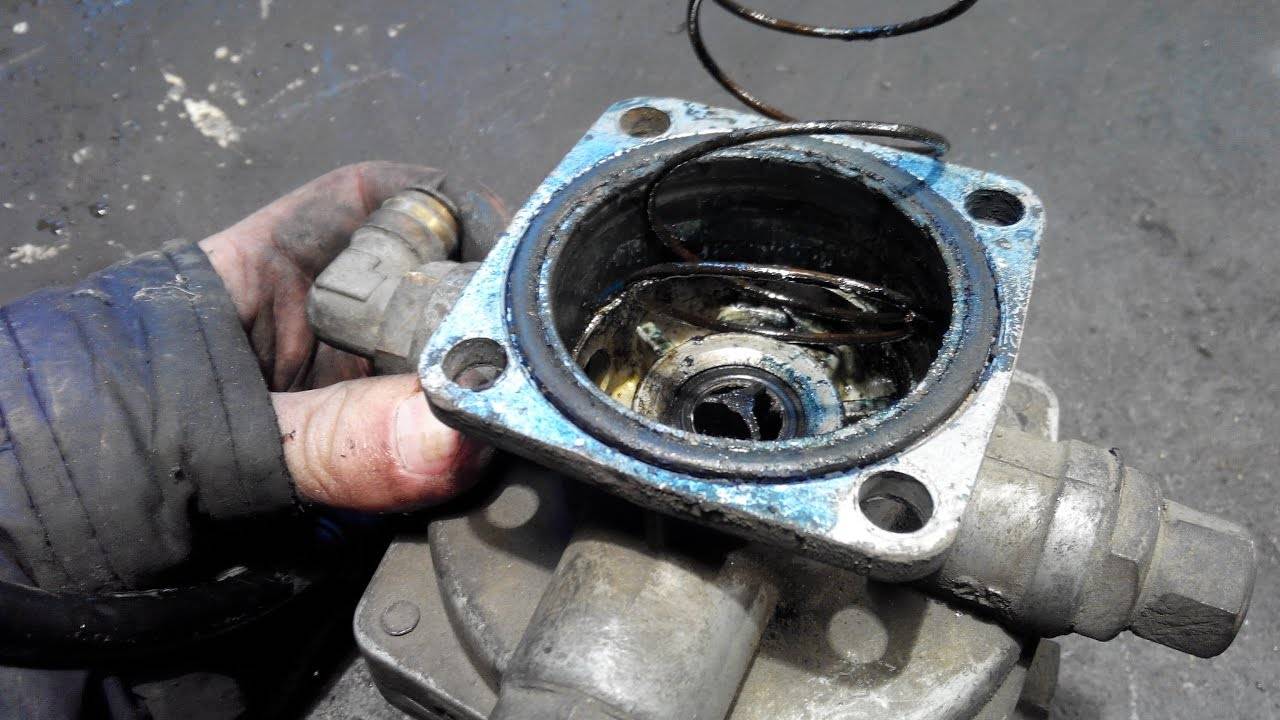 Если поломка была вызвана неисправностью клапана, нужно открутить крепежные винты, разъединить корпус и вытащить малый поршень, раскачивая большой.