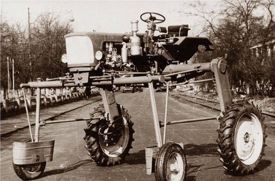 Такая машина может быть получена непосредственно в хозяйстве из обычного трактора Т-25 путем его переоборудования с установкой дополнительных узлов: удлиненных рукавов задних колес, стоек передних и задних колес, переднего балансира. После выполнения работ по обработке высокостебельных культур специальное оборудование может быть снято и трактор использован в своем обычном виде.