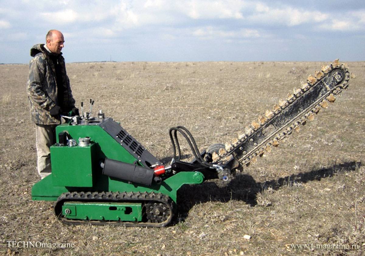 - Наиболее распространён траншеекопатель, который работает на основе использования цепи. Этот инструмент по внешнему виду очень похож на гигантскую бензопилу траншеекопатель. Такой инструмент пила отлично подходит для использования в сельской местности. Оборудование может быть применено вместе с популярными в России марками мотоблоков: Нева, МТЗ, Агат, Ока и некоторыми другими.