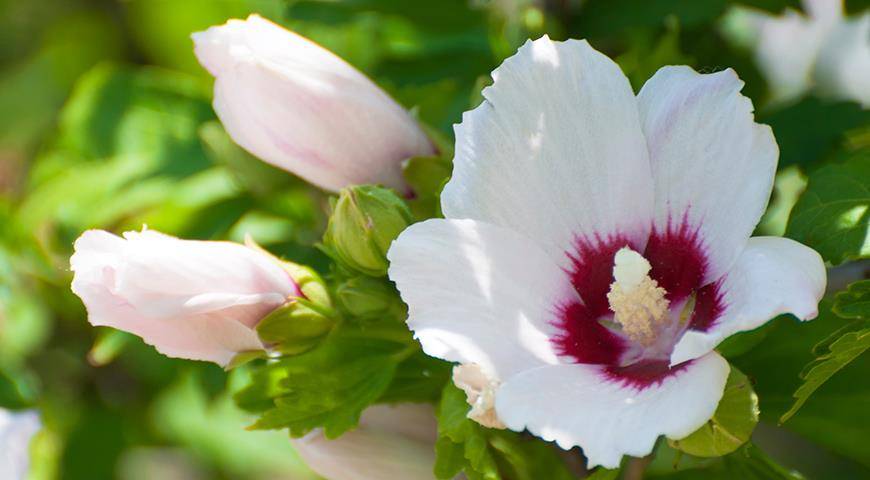 - Сирийский (Hibiscus syriacus) – распространенный многолетний вид в России для выращивания в открытом грунте. Морозостойкий, многолетний, кустарниковый;