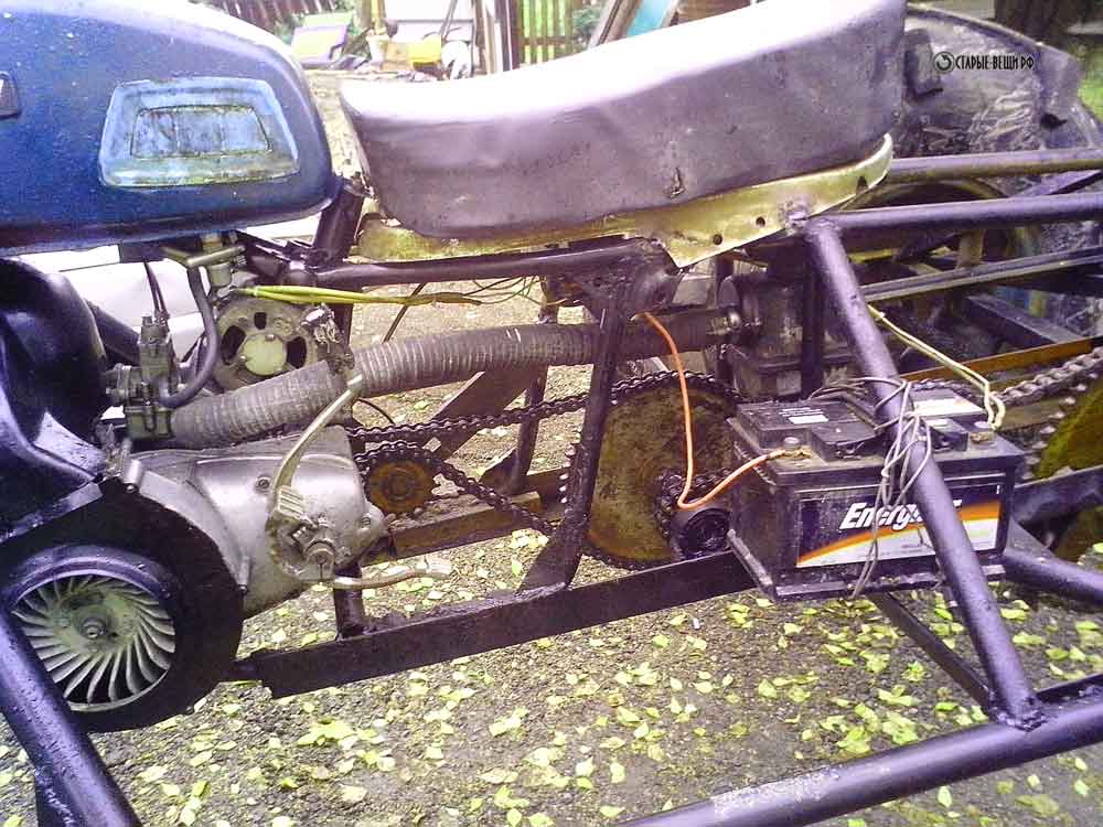 - В середине рамы закрепляется водительское сиденье. При установке используется рессора, которая гасит неровности грунта;