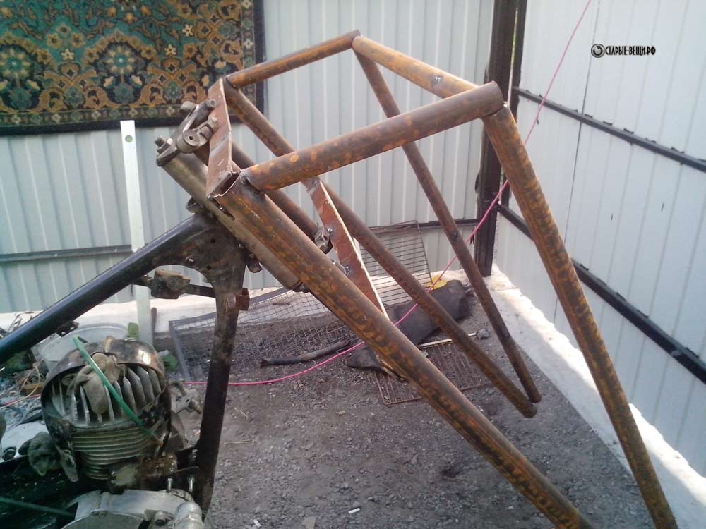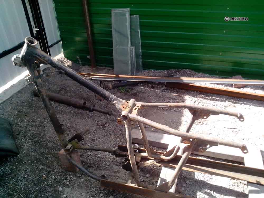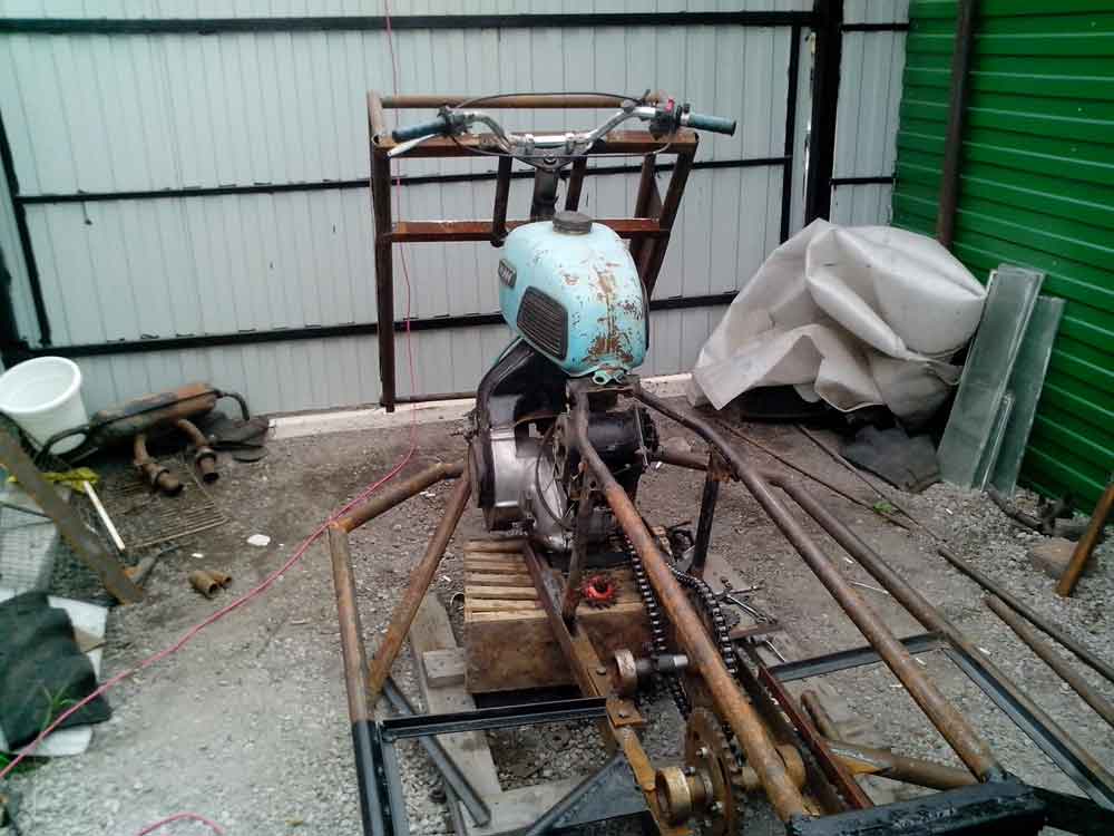 Устанавливаем раму, рама кстати от мотоцикла иж. Почему от Ижа? Потому что двигатель будет ИЖ, крепление переделывать не нужно и рама вполне крепкая сама по себе.