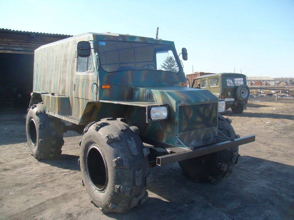 Стоит учитывать назначение транспортного средства. Если требуется болотоход на базе УАЗ, нужно использовать другой тип колёс, который сможет противостоять трясине и грязи. Для этого лучше конструировать гусеничный вездеход на базе УАЗ.