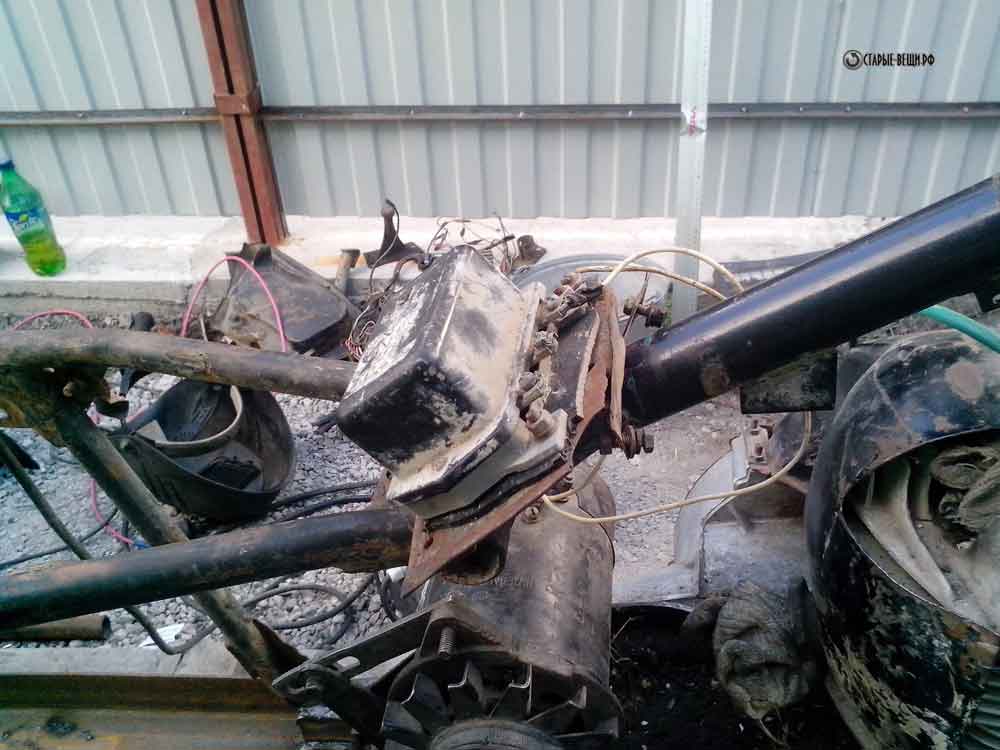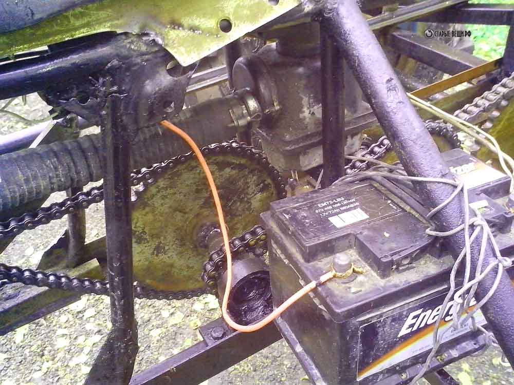 Сидение поставили от мотоцикла Восход т.к. она была в наличии. Для установки этого сидения пришлось часть рамы взять и приварить с того же Восхода. Аккумулятор временно на тестовый запуск привязали проволокой.