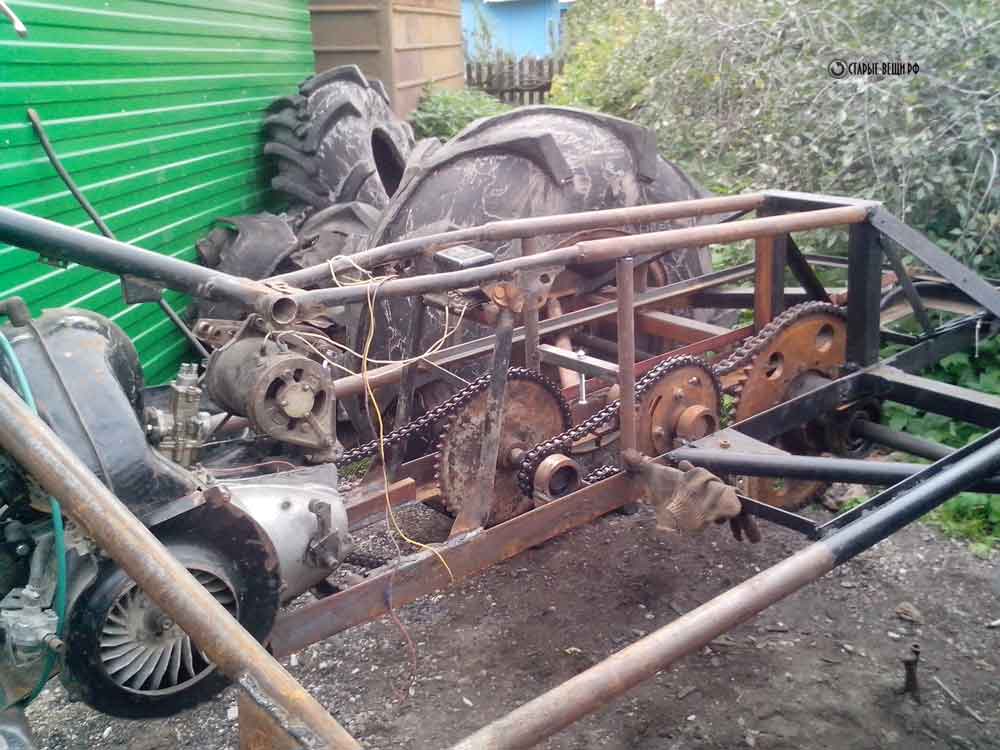 Двигатель стандартный от «Урал», коробка от МТ «Днепр», дополнительно установлен понижающий редуктор 1 к 3,5. На задней оси установлен задний мост от «Жигулей».